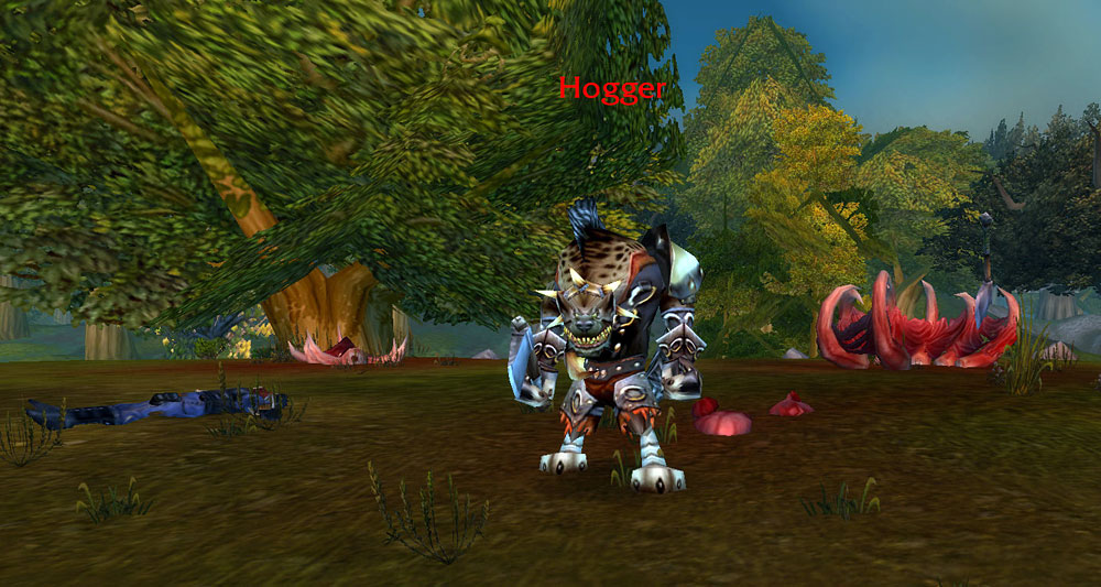 Hogger is a level 11 elite named Riverpaw gnoll chieftain in Southern Elwynn Forest. A quest exists offering a reward for his killing from the Westbrook Garrison in Elwynn Forest, near the border with Westfall. He is an indirect agent of the Defias Brotherhood along with the rest of his Riverpaw tribe.